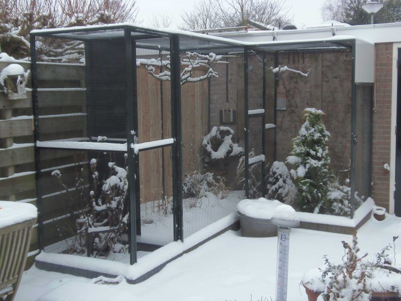 De voliere is tegen de schuur aangbouwd, waardoor de vogels door een gat in de muur de binnenhokken kunnen bereiken. Tevens worden een tweetal ruimten gebruikt als uitvliegkooi voor jonge vogels. De nachthokken en de uitvliegkooien zijn verlicht van 06.00 uur tot 21.00 uur.